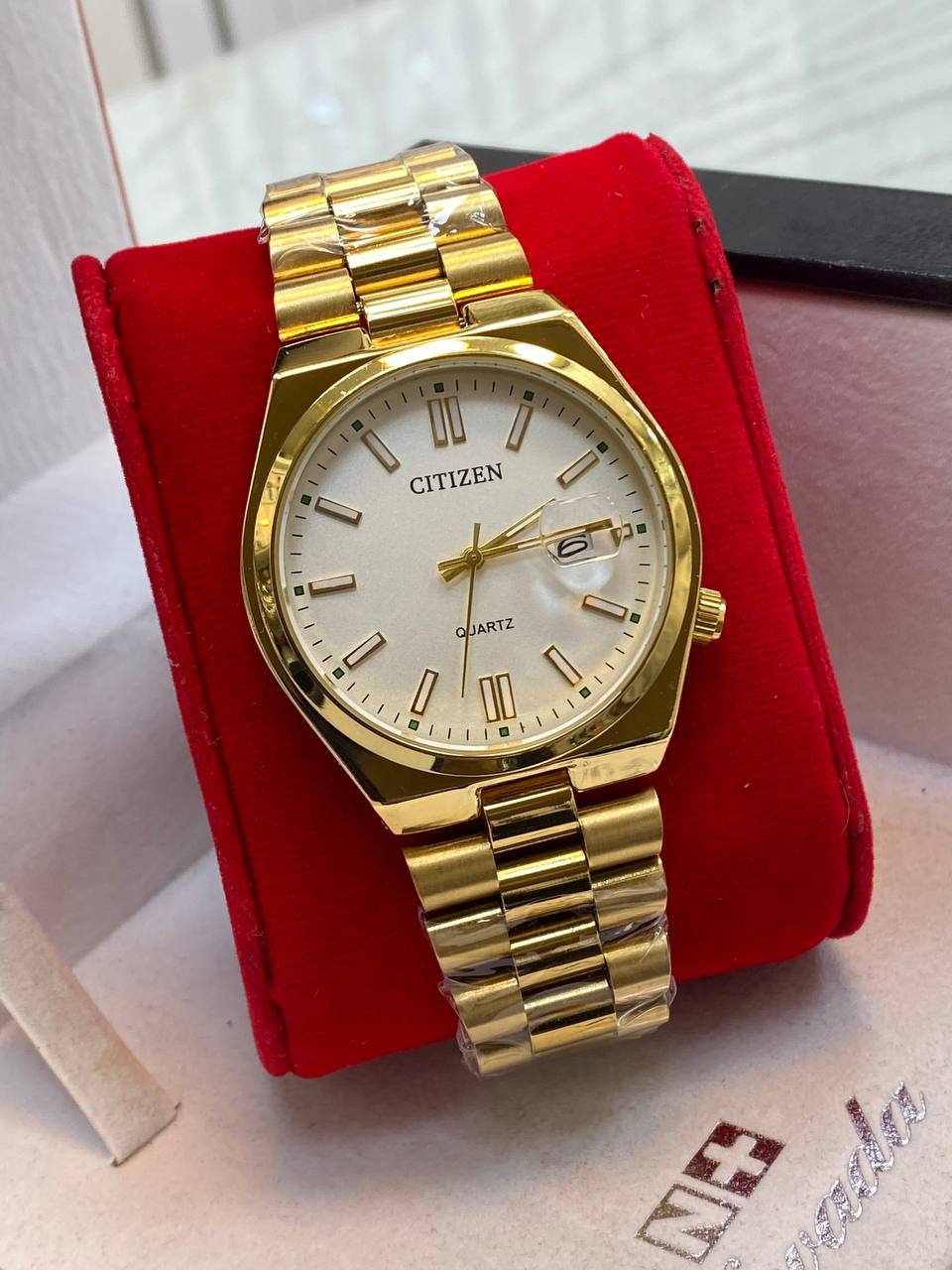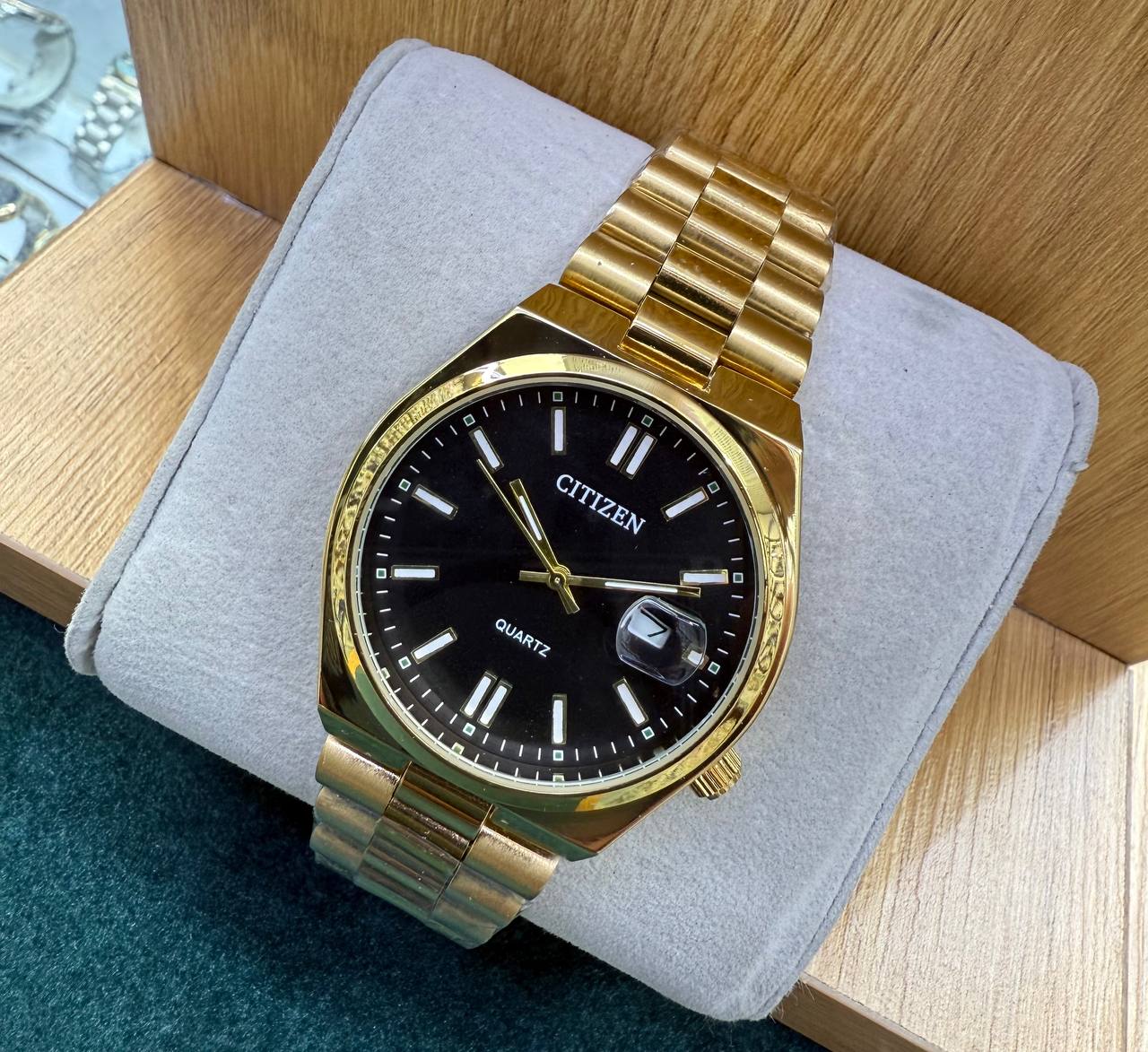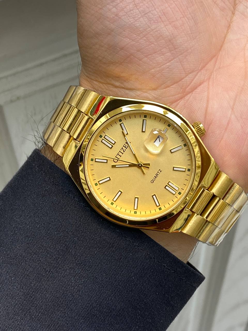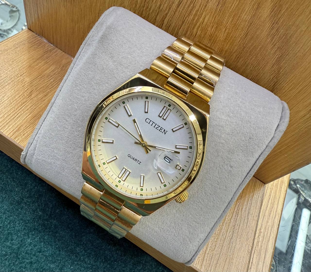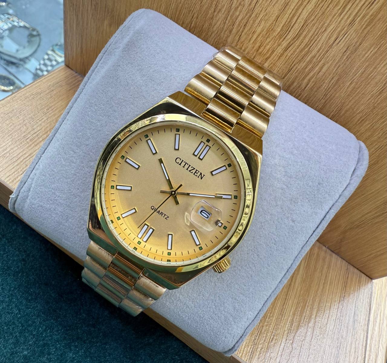 ساعت مردانه سیتیزن مدل اکو درایو کیفیت عالی بند استیل قفل پروانه ای موتور کوارتز بسیار دقیق دارای تقویم روزشمار رنگ طلایی ضد آب در حد شست و شوی دست دارای جعبه